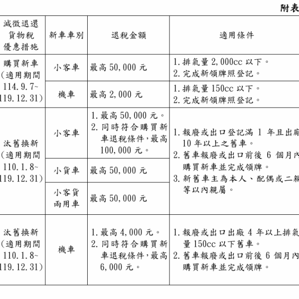 不僅舊換新、新購汽機車也可「退還貨物稅」