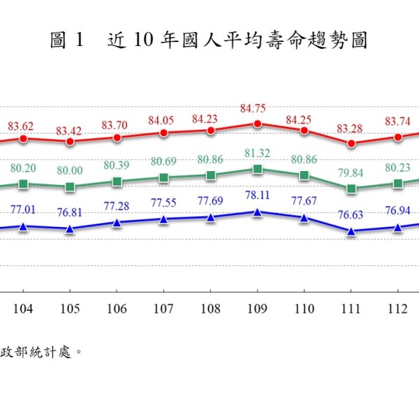 去年國人平均壽命80.77歲 較上年增加0.54歲 由北向南、西向東遞減