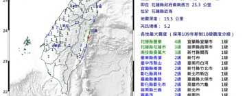 花蓮近海發生芮氏規模5.2地震