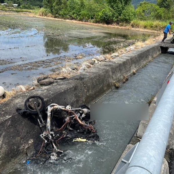 女騎機車越對向車道 掉深排水溝竟自己燒起來