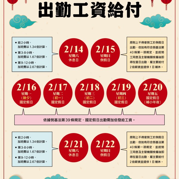 縣府提醒春節出勤工資計算,國定假日出勤必須加倍給薪