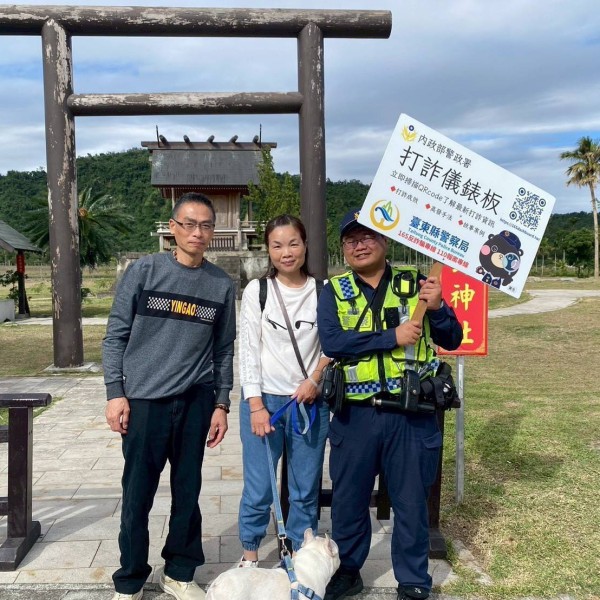 鹿野警察走入龍田神社遺跡 手舉牌向遊客宣導防詐與交通安全
