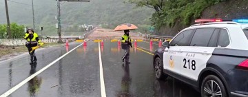 颱風豪雨土石流造成龍過脈段道路中斷 鹿野警雨中拉起封鎖線及三角錐示警守護行車安全